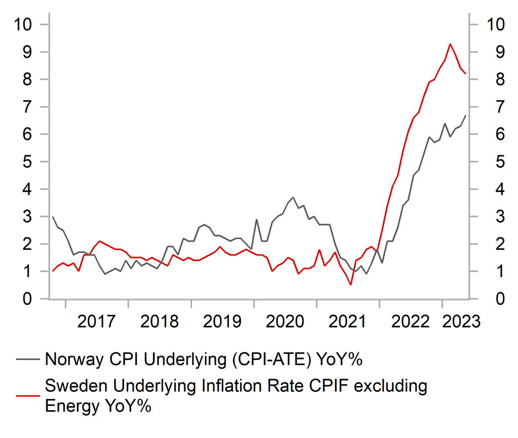 After staging a strong rebound through the first half of this month, the NOK has corrected sharply lower again over the past week. EUR/NOK and USD/NOK failed to break below strong support at 11.500 and 10.500-levels respectively in the middle of the month and have since rebounded. The price action over the past week highlights that it remains difficult for the NOK to stage a sustainable rebound in the near-term even after the Norges Bank acted decisively this week to provide more support for the NOK. The Norges Bank backed up their hawkish guidance over the past month by delivering a larger 50 bps hike that lifted the key policy rate to 3.75%. It marked a step up in the pace of rate hikes after two consecutive 25bps hikes at the start of this year. The Norges Bank previously delivered a larger 50bps hike in September of last year. The decision to raise rates by 50bps reflects the Norges Bank’s heightened concern that higher inflation could become “entrenched”. The recent run of markedly higher inflation, higher wage growth and a weaker NOK have reinforced those concerns. The Norges Bank reiterated that if the NOK turns out to be weaker than assumed, a higher than projected policy rate may be needed to bring inflation down to target. The updated projections revealed that the Norges Bank is already planning to raise the policy to a higher peak of 4.25% by the autumn with the next hike likely in August. The Norges Bank did caution though that the full effect of past hikes are not yet fully evident.