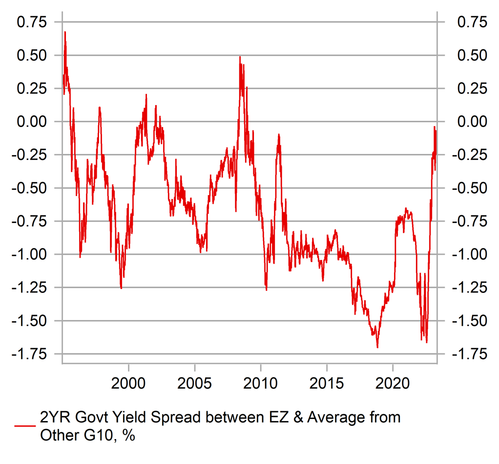 The key EUR-specific event risk in the week ahead will be the ECB’s latest policy update. We are not expecting the ECB’s latest policy update to trigger a reversal of the EUR’s current upward momentum. The EUR has benefitted from the upward adjustment in euro-zone yields since the summer of last year. Heading into next week’s policy meeting, the euro-zone rate market is expecting the ECB to deliver a 25bps rate hike, and then to keep hiking rates through the rest of this year until the deposit rate reaches a peak of 3.75% by September. The ECB’s aggressive rate hiking cycle since last summer has resulted in yield spreads narrowing significantly between the euro-zone and the rest of the G10 bond markets on average to levels not seen for over a decade (chart 2). Next week’s ECB policy update is unlikely to materially alter the more supportive yield spread set up for the EUR. If the ECB steps down the pace of hikes by delivering a smaller 25bps hike as expected, we expect the forward guidance to signal more hikes are still needed this year.