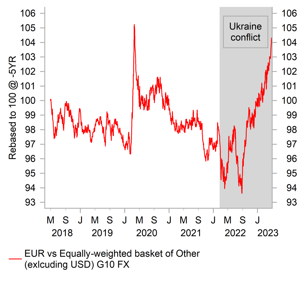 The EUR has continued to outperform over the past week ahead of the ECB’s upcoming policy meeting next week. The EUR alongside the GBP and CHF have been one of the three best performing G10 currencies of so far this year. Over the past week, the EUR hit fresh year to date highs against the USD, JPY, AUD, NZD, NOK and CAD. It has resulted in the EUR rising to its highest level against our equally-weighted of other G10 currencies since the peak of the COVID crisis in March 2020. The EUR has now strengthened significantly by around 11.5% on average against other G10 currencies since the low point in August of last year when the negative impact of the Ukraine conflict/terms of trade shock weighed down heavily on the EUR. Recent price action highlights the EUR still has strong upward momentum giving us confidence that it will continue to strengthen further in the near-term.
