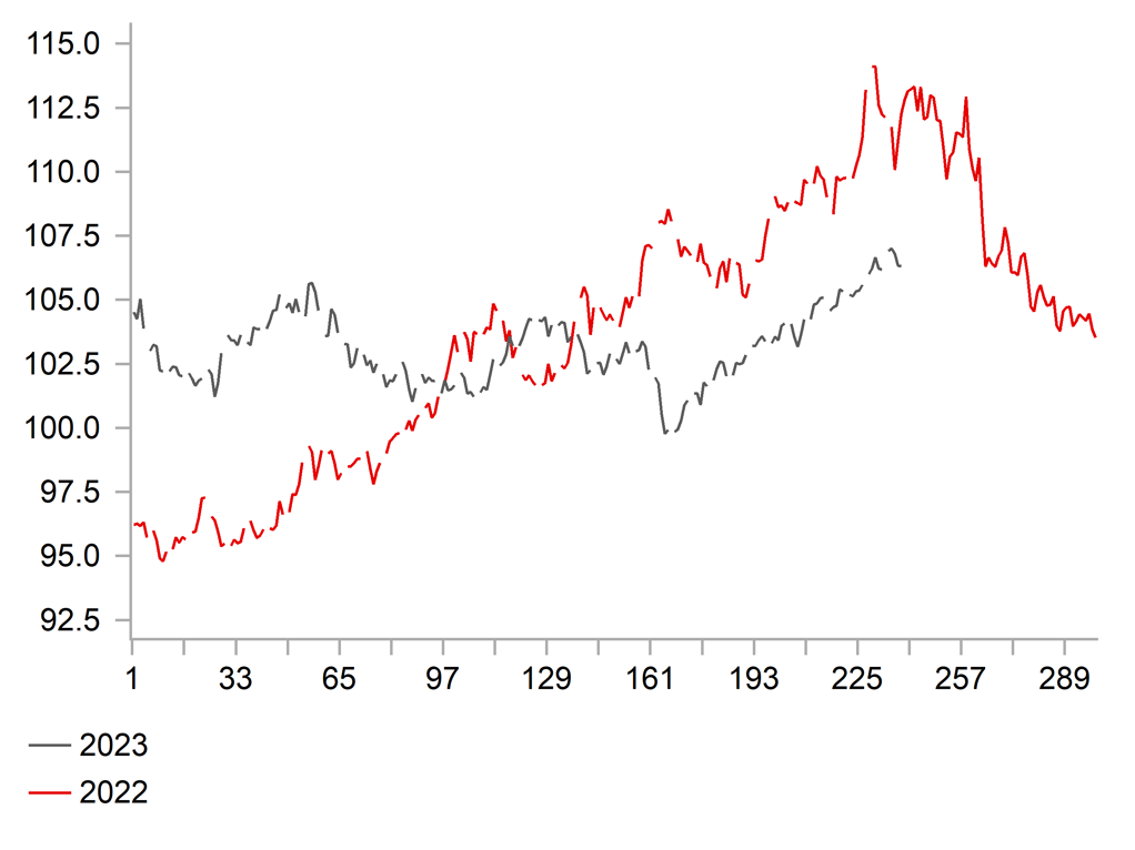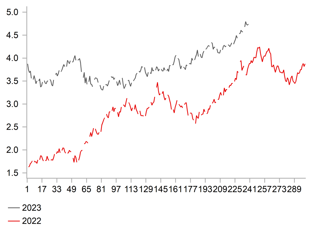 It has been a more volatile week in the foreign exchange market which continues to be driven mainly by spill-overs from the US bond market. The sell-off in the US bond market has accelerated over the past month resulting in the 10-year US Treasury yield hitting a fresh cyclical high of 4.89%. It has extended the upward adjustment to 84bps since the low at the start of September and almost 160bps since the low in May. It has been the biggest move higher in US yields since last year when the 10-year US Treasury yield increased by just over 180bps from the low last August to the high from last October. On that occasion the dollar index strengthened sharply by almost 10% to the peak in September of last year followed by a brief period of consolidation in October and, and then finally correcting sharply lower from November into early this year. On this occasion, the dollar index has strengthened sharply again by almost 8% from the lows in July. While we believe that the bulk of the upward adjustment for US yields and the USD has already taken pace now, it is not clear that a peak is yet in place.