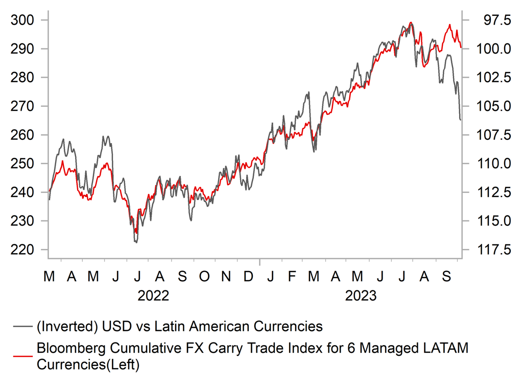 The sharp move higher in US yields is becoming more disruptive for financial markets. MSCI’s ACWI global equity index has declined by around -9% since the end of July which compares to a fall of -16.5% between August and October of last year. Volatility has been picking up both in the US fixed income and FX markets. The MOVE index measure of US bond market volatility recently jumped to the highest level since late May which is now spilling into higher volatility in FX market although JP Morgan’s measure of Global FX volatility remains close to year to date. The pick-up in financial market volatility and deterioration in investor risk sentiment has been triggering an unwind of popular carry trades in the FX market. The high yielding emerging market currencies from Latam have been hit the hardest over the past week. The COP (-6.4% vs. USD), MXN (-5.2%), and BRL (-3.4%) have all weakened sharply against the USD. In spite of the recent sell-off all three currencies are still stronger against the USD on a year to date basis suggesting there is still room for the reversal of carry trade gains to extend further in the near-term. The COP is still up by +11.6% vs. USD YTD, the MXN by +6.0% and BRL by +1.3%.