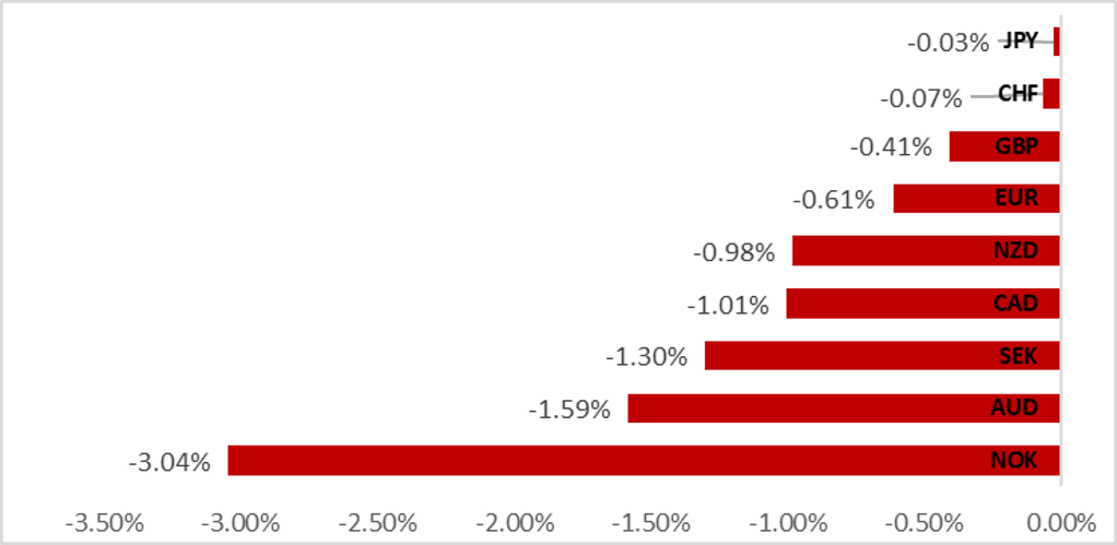 renewed weakness in commodity prices has weighed more heavily on the G10 commodity currencies over the past week when the NOK (-3.1% vs. USD), and AUD (-1.6%) have been the two worst performing G10 currencies. The weakness in commodity prices and related currencies could be an indication that market participants are becoming more wary again over the irks of harder landing for the global economy is the major central banks are strongly committed to keeping rates at more restrictive levels for longer until there is clearer evidence of slowing growth and inflation falling back to target. The higher for longer mantra adopted by central banks recently signals a higher risk of tightening policy too much rather than too little.