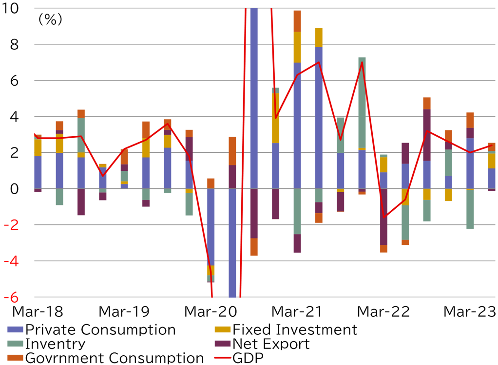 The biggest event in August would normally be the Fed Chair's speech at the Jackson Hole economic symposium. However, the event may not be in sharp focus this year. The Fed is unlikely to be able to suggest a new direction given the widely shared view that it is set to raise rates one more time this year and then cut rates in 2024. Market attention is already focused on the FOMC in September and November. The Fed's decision will hinge on employment and price data. In addition, when looking at exchange rates, there is currently more interest in the economy itself than in the outlook for monetary policy. The Fed is also more confident in this regard, and fears of a recession have receded considerably. Real GDP growth in 2Q, announced on 27 July, also exceeded market expectations (Figure 4). Expectations for the bottoming out of the economy are prompting a rise in stock prices and a recovery in risk tolerance. This suggests a move to dollar selling (and yen selling) in the foreign exchange market. We expect dollar-selling sentiment to persist unless a series of indicators disappoint expectations. The question is whether monetary policy will become a theme again after the Jackson Hole symposium in September.