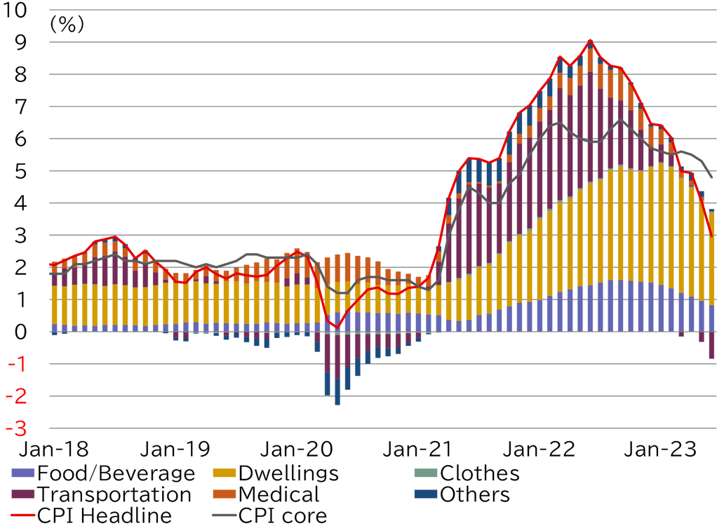 The US CPI for June showed a steady slowdown in inflation for each item (Figure 3). Both the headline and core inflation rates were lower than market expectations and were labelled a "reverse CPI shock." The details of the CPI report also seem to have roiled the Fed. It probably welcomes a curbing of inflation, but the details suggest that inflation is decelerating at a faster pace than the Fed had forecast in June. For example, Fed Governor Christopher Waller gave a speech on 13 July in which he suggested the Fed could raise rates in both July and September. However, his comments may have been intended to restrain growing expectations in the financial markets of an early halt to rate hikes. At the subsequent FOMC meeting, the Fed raised rates by 25bp as it had hinted at in advance, and the target for the federal funds rate was set at 5.25%-5.50%. However, the statement only slightly revised up the economic assessment and Fed Chair Powell also left the door open to another rate hike in September. This was pretty much business as usual and not as hawkish as had been feared following Waller's comments. Powell said that rate hikes would depend on incoming data, but that even a reverse CPI shock cannot be judged based on a single data set. The dot plot in the SEP projections for June now show just one more rate hike within the year, but Powell did not give any definitive answer on when or if the Fed would make such a move. After the CPI report, (in other words, before the FOMC meeting), the FF interest rate futures market priced in a final rate hike in July, followed by more than five rate cuts over 2024. The market has slightly revised expectations for rate cuts next year, but still prices in no more hikes in 2023. The Fed has kept the door open to another rate hike this year, and this gap in the outlook is likely to remain open ahead of the summer holidays.