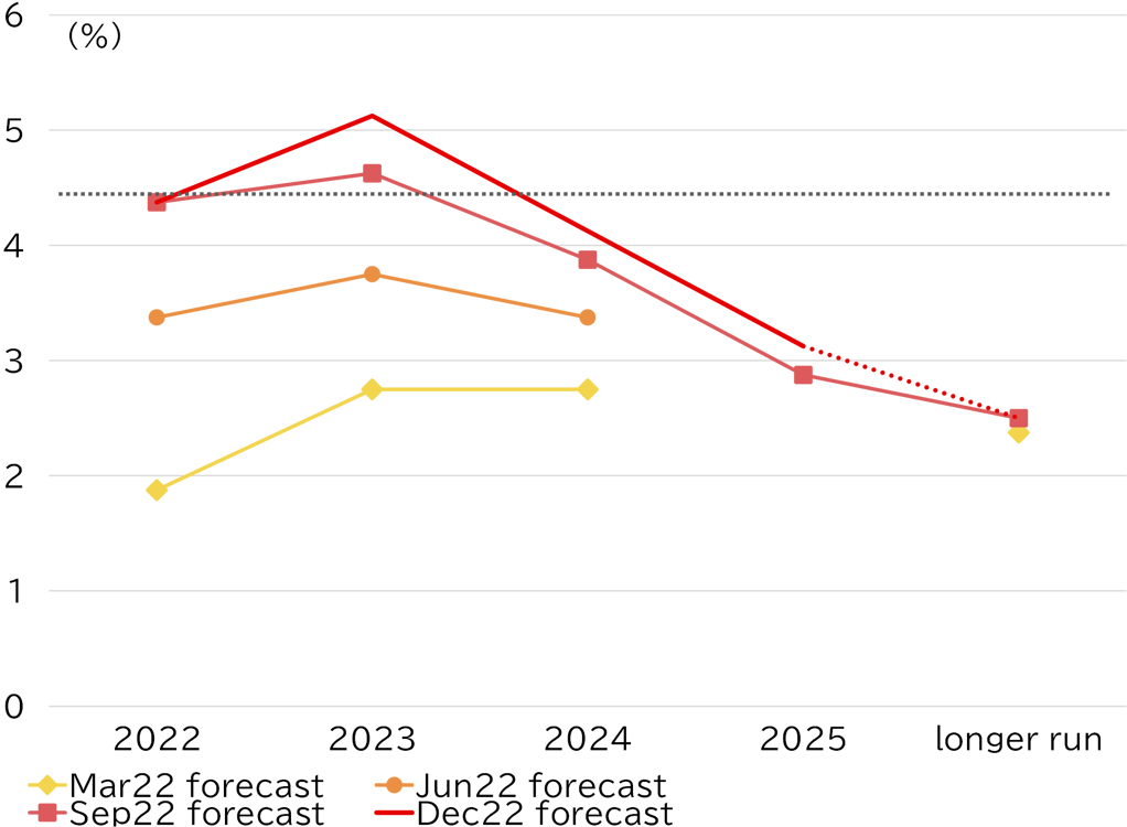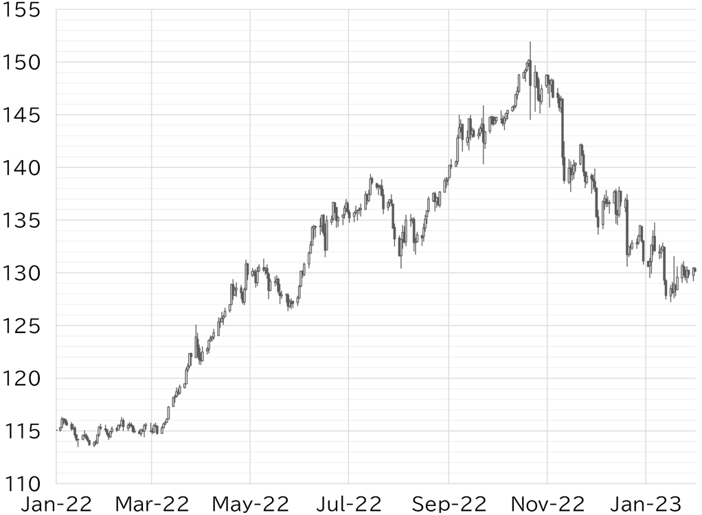 We had expected the BOJ to begin normalizing monetary policy after the appointment of a new governor in April, but we brought forward this timeline following the Bank's monetary policy meeting in December. We shifted our forecast range for the USD/JPY to reflect a stronger yen. We had expected the FOMC to gradually reduce the pace of rate increases with a 50bp hike in February and a 25bp hike in March but anticipated that Chair Powell and other Fed officials would maintain a hawkish stance in dialogue with the market, and as a result, we expected the USD/JPY to return to around 140. However, leading US economic indicators and other data in January continued to show signs of an economic slowdown, and comments from regional Fed presidents and high-ranking officials including Fed Vice Chair Lael Brainard and Fed Governor Christopher Waller suggested that the FOMC would slow the pace of rate increases to 25bp in February. We expect the US economy will start to slow in earnest and that hitting the federal debt limit will put downside pressure on the economy. The risk of turmoil in the financial markets has also reduced the scope for the dollar to strengthen and the USD/JPY to pull higher in the near term. We have therefore revised our forecast range for the USD/JPY.