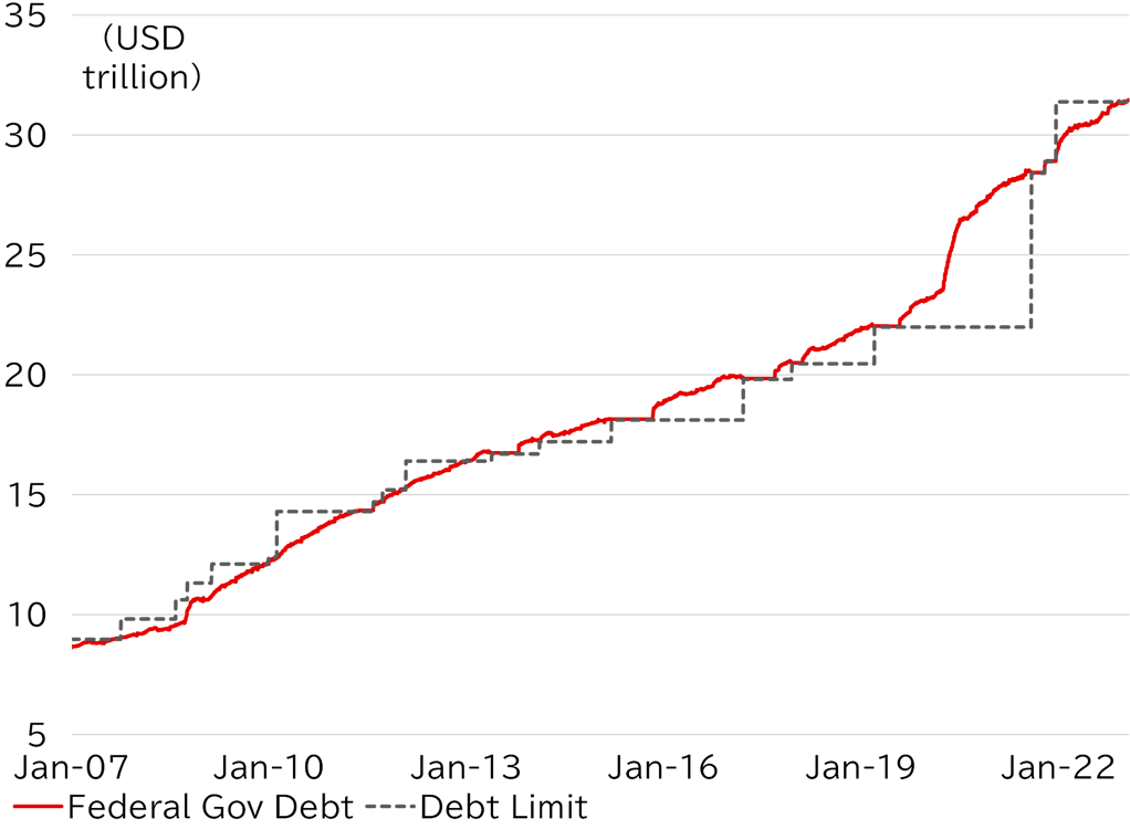 Meanwhile, the prospect of hitting the federal government debt ceiling has recently emerged as an issue (Figure 6). Treasury Secretary Janet Yellen announced on 19 January that the debt limit had been reached. The government has already taken special measures such as suspending contributions from government agencies to civil servants' retirement funds. The special measures and tax revenue will sustain other government spending for the time being, but without raising or suspending the debt limit, the government will soon face the prospect of being unable to make interest payments on USTs or make payments to private companies and may have to suspend civil servant salaries. However, we see little prospect of resolving the crisis at the moment since Congress became divided following the midterm elections in November last year, and although the Democrats hold a majority in the Senate and the Republicans a majority in the House, both parties are having trouble rallying their caucus. Yellen has set a 5 June deadline for the special measures, though it is unclear when government payments that depend on tax revenue will stop. We expect a response will be required within the next six months.