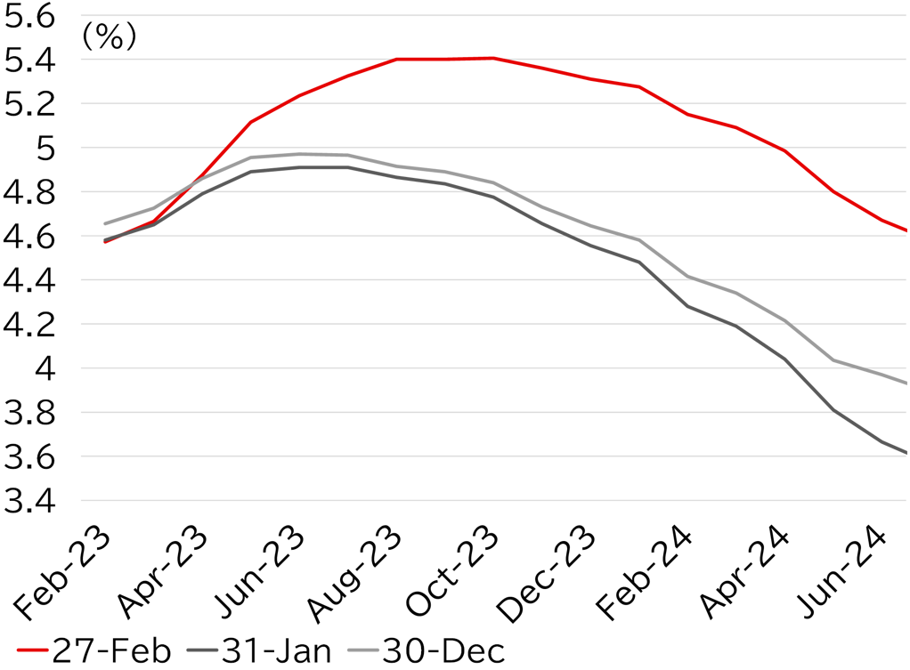 Some argue that the FF rate needs to be raised to the 6% level because the US economy looks set for a "no landing" scenario, rather than the hard landing that had been feared or the soft landing the Fed was aiming for. Amid this, the FOMC meeting on 21-22 March is drawing an increasing amount of attention. Some observers expect the Fed to reaccelerate the pace of hikes with a 50bp increase, although this is not the consensus. The FOMC will also release its quarterly summary of economic projections (SEP) and update the near-term FF rate outlook (Figure 4). Currently, the market consensus seems to be that the terminal rate will be 5.50%, and that the Fed will end its hiking cycle in June. However, the forecast for the terminal rate could be raised and the timing for an end to rate hikes and the start of rate reductions shifted back depending on economic indicators such as February employment statistics (10 March) and the CPI (14 March), which will be announced before the FOMC. In that case, the 10y UST yield is likely to again reach the 4% level and the dollar could strengthen further. Fed Chair Powell said on 7 February that inflation is starting to slow but he expects a long, bumpy road ahead. The Fed and the markets seem to have leaned too far into the idea of disinflation, even though it should have been widely known that demographic trends make solving the labor shortage a tough task, meaning the path to curbing inflation would be a long one. The markets seem to currently be in a phase of swinging back from this.