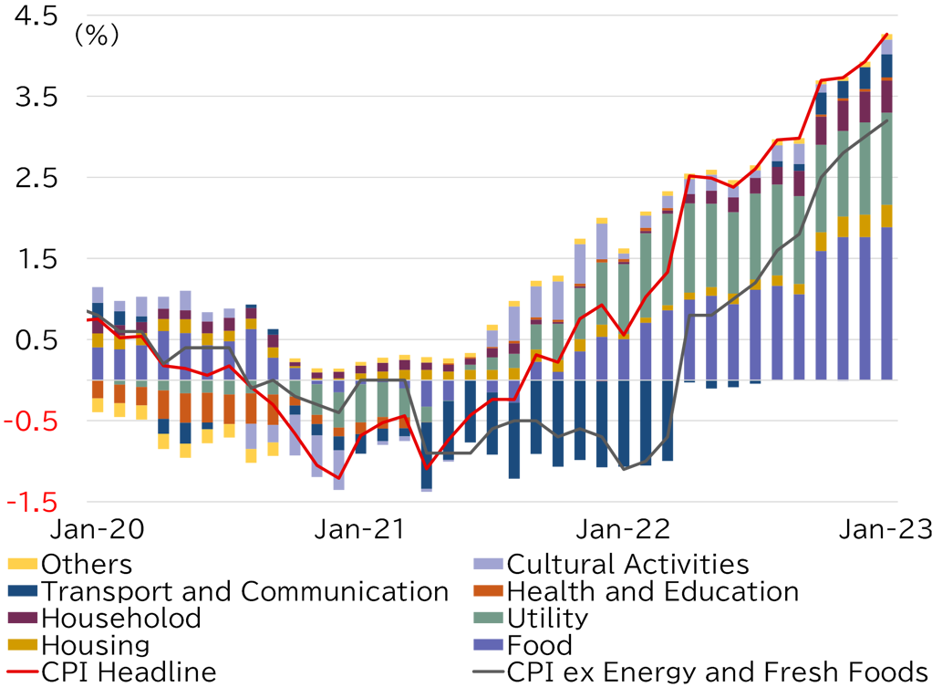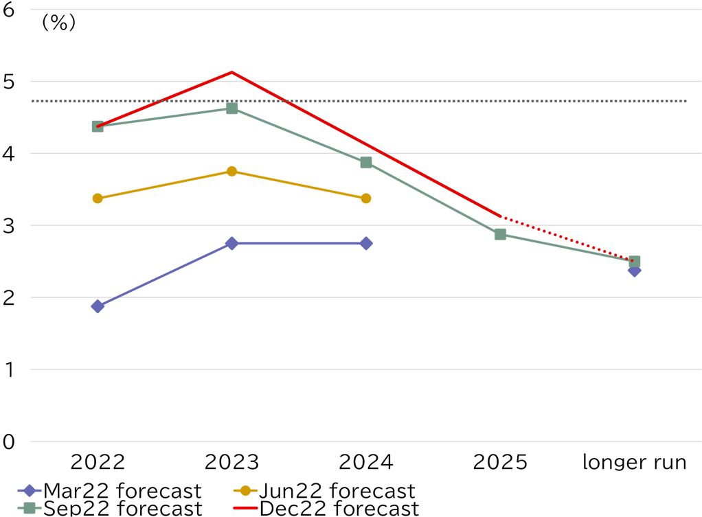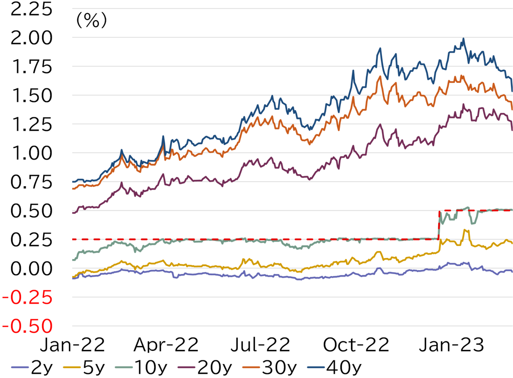 That said, imputed rent, which is currently pushing up YoY CPI growth, will decline with a lag of several months. Given that actual rents have already fallen considerably, we do not think it is necessary at this point to change our view on slowing inflation. In addition, according to BOJ governor nominee Kazuo Ueda, the impact of changes in monetary policy should be felt in six months at the earliest, and two or three years at most. Considering that the downward pressure on the economy due to rapid and substantial monetary tightening is now in full swing and based on the cumulative impact of rate hikes to date, we do not think considerations of monetary policy have shifted from estimating the timing of an end to rate hikes to again assuming rate hikes will continue. In that regard, US long-term interest rates may test the 4% level in the near term, but we expect a downward turn again over the next few months.