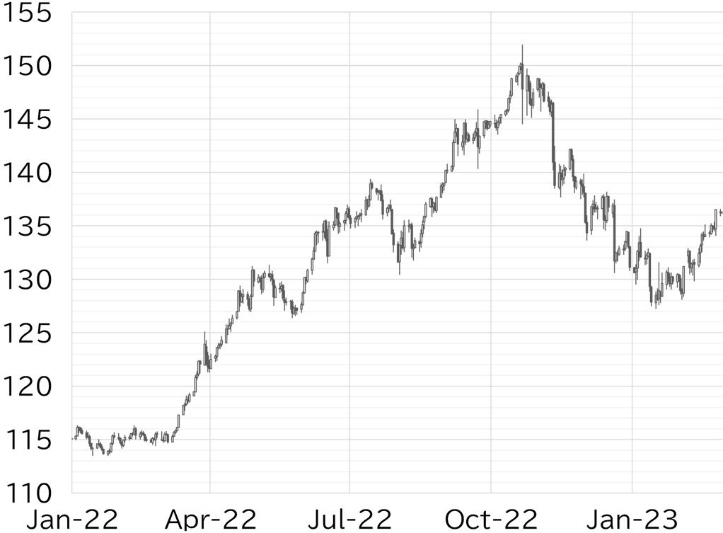 The USD/JPY rose by over 8 yen in February, from a low of around 128 to around 136.5. The monthly candles formed a white candlestick for the first time in four months. This mainly reflected the change in the outlook for US monetary policy in the financial markets. The view rapidly took hold that the Fed's rate hike cycle would be ‘higher and longer’ than had been expected. The appointment of a new BOJ Governor also likely played a part. However, we think it is too early to conclude that the widening disparity in monetary policy between Japan and the rest of the world was behind the dollar strength and yen weakness, as had been the case through October last year.