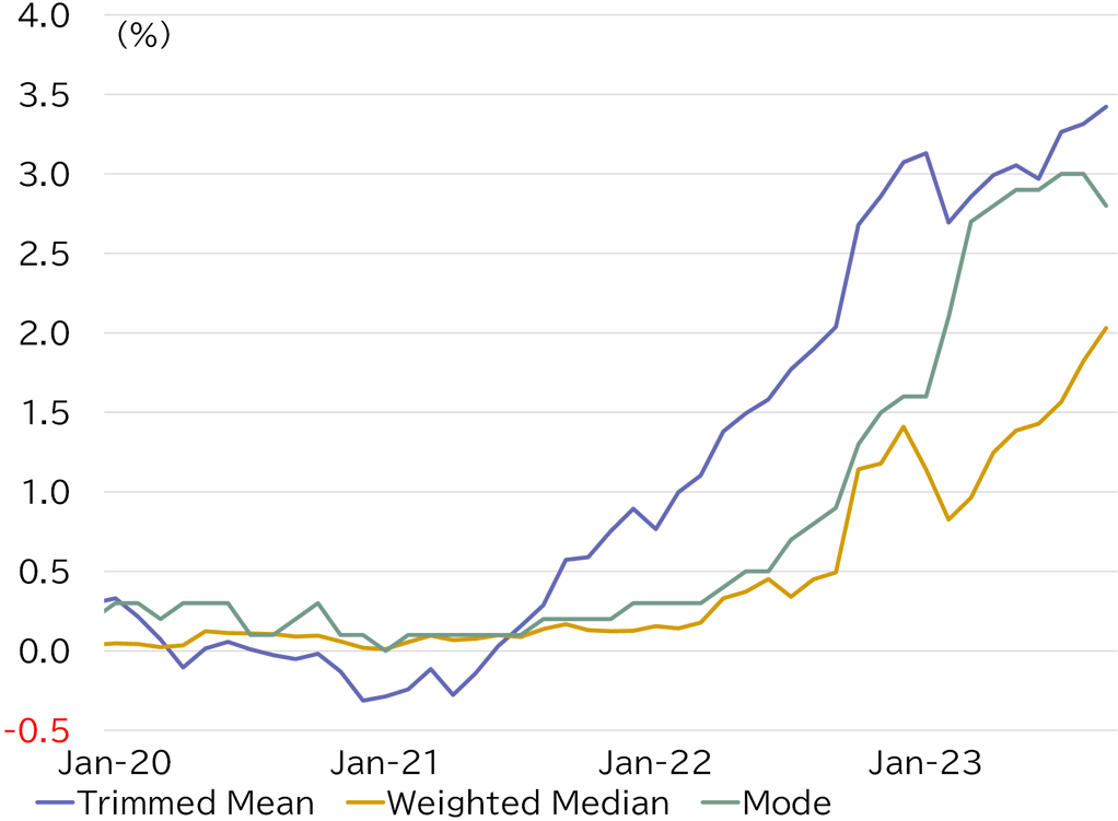 The trimmed mean is obtained by excluding the upper and lower tails (here, the 10 percent tails) of the price change distribution adjusted for item's weight in the CPI. The weighted median is the weighted average of the inflation rates of the items at around the 50th percentile point of the distribution. The mode is the inflation rate with the highest density in the distribution.