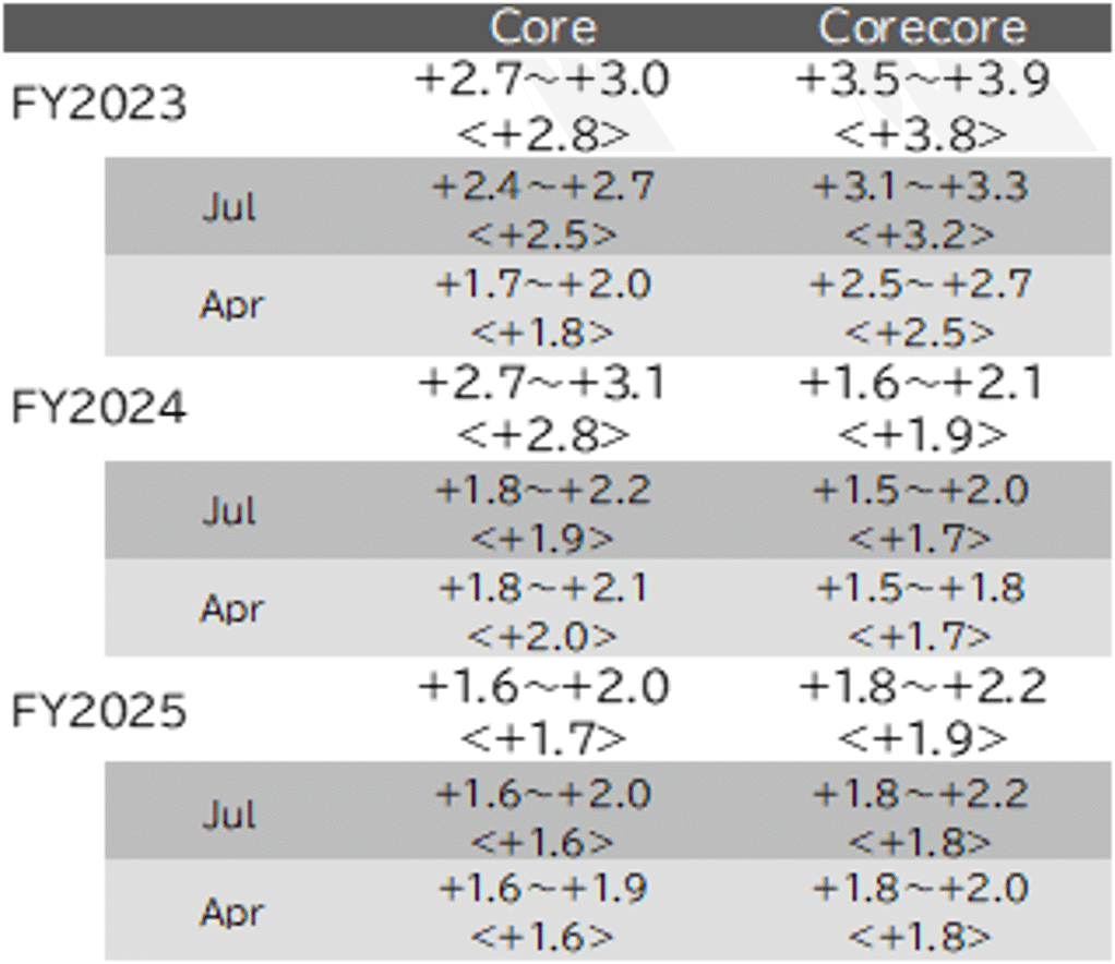 The growing interest rate differential due to the rise in US rates has been putting upward pressure on the USD/JPY. Jawboning by Japanese authorities has kept the USD/JPY from a sustained rise above the psychologically significant 150 mark. However, with the rise in US rates, long-term JGB yields are also approaching the upper limit of 1.00%, which Governor Ueda positioned as a safeguard, meaning the BOJ policy meeting on 31 October drew attention as a key event in determining the direction of the USD/JPY. The forex market priced in the possibility of policy revisions after reports about a revision of inflation forecasts in the Outlook Report were followed by a Nikkei article on 22 October saying that the BOJ was considering another revision of its yield curve control policy. However, this amounted to allowing long-term rates room to rise while keeping the YCC framework in place, which worked to curb a rise in the USD/JPY but was not enough to encourage a strong move to buy back yen. Ultimately, the BOJ voted to further increase the flexibility of YCC, largely in line with prior reporting. Specifically, it removed the approximately ±0.5% fluctuation range as a target for long-term interest rates in the conduct of yield curve control and set the upper limit at 1.0%. It also ended its policy to conduct fixed-rate purchase operations in principle on every business day up to 1%, effectively allowing interest rates to rise above 1%. Meanwhile, the Outlook Report released at the same time showed the inflation forecast (core basis) for both FY23 and FY24 had been raised well above 2%, and the forecast for FY25 was also slightly revised upward (Table 1).