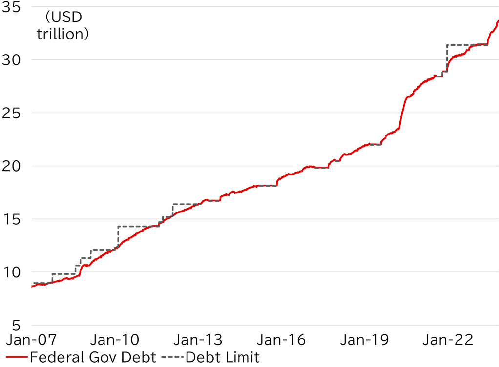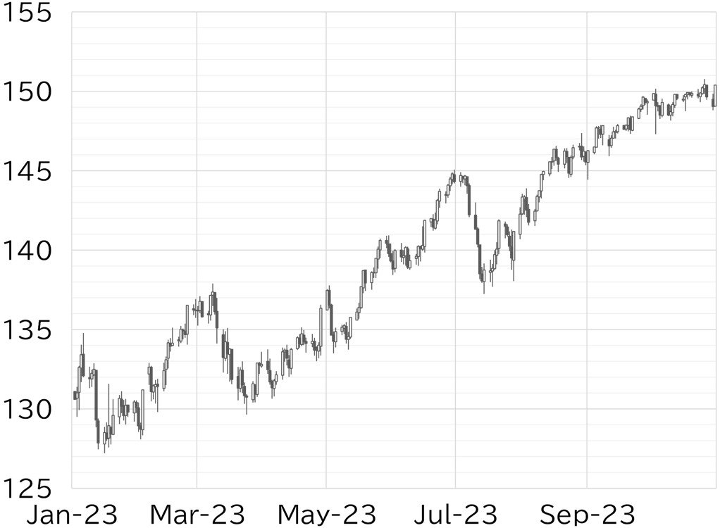 In these circumstances, share prices have been adjusting, partly because prices have increasingly been looking relatively expensive. Bank credit balances are also declining, albeit slowly. This suggests the impact of monetary tightening is gradually increasing, resulting in the view that further rate hikes are unnecessary. Senior Fed officials have also repeatedly said that the rise in long-term interest rates is a substitute for further monetary tightening. The FF interest rate futures market has priced in about an 80% possibility that the Fed will leave rates on hold at the next meeting in December. In other words, the market outlook continues to be weaker than the forecast in the dot plot published at the September FOMC meeting. At the least, it is likely that the FOMC will decide to leave the policy rate unchanged at the meeting held on 31 October through 1 November.