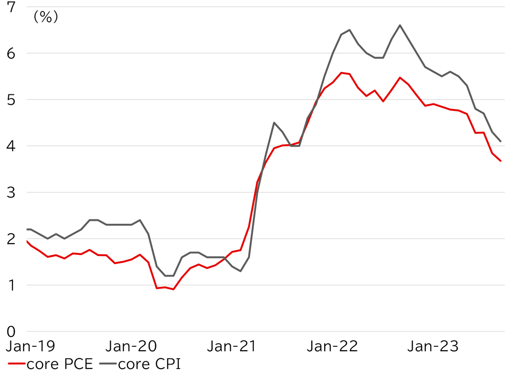 Meanwhile, on 18 October, Fed Governor Christopher Waller that if inflation appears to stabilize or reaccelerate, more policy tightening is likely to be needed despite the recent run up in longer term rates. Fed Chair Jay Powell in a speech on 19 October said continued strong growth and tight labor market conditions "could warrant further tightening of monetary policy." US newspapers have reported that Powell is satisfied with the recent slowdown in inflation, but neither official seems to think this is enough to rule out the one additional rate hike suggested by the dot plot. Rather, we see the possibility that the one extra rate hike could be pushed back to next year. The 3Q core PCE deflator, released after Powell's speech, showed a slowdown in inflation. This probably did not come as a surprise. However, Governor Waller has indicated that he wants to confirm inflation data across multiple reports, and Chair Powell is likely to maintain his stance that further hikes are possible at his press conference on 1 November. This may curb the view that rate hikes are unnecessary but is unlikely to build a consensus. We will therefore need to wait on the release of major economic indicators for October, such as employment statistics and the CPI, following the FOMC meeting to assess the outlook for a short-term decline in US rates and a weaker dollar.