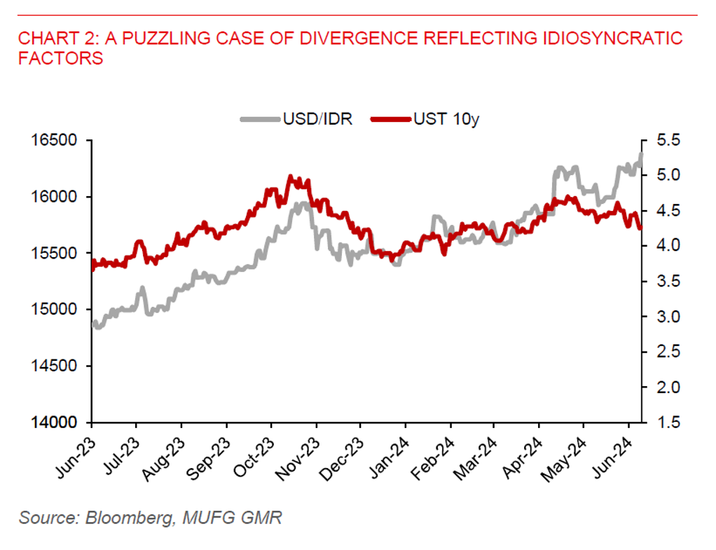 - We have been cautious about the rupiah for quite some time, but today’s sharp depreciatory move has surprised us, partly as this has happened against the backdrop of a pullback in US yields (Chart 2) and only very modest US dollar strength over recent trading sessions. Moreover, implied rupiah volality is lower today compared to the mid-April high. Prabowo’s expansionary fiscal plan is nothing new to markets either, since he has earlier pledged to increase spending to finance his populist plan to provide free lunches for children, among others, which could cost the government as much as IDR460tn (US$28bn) a year.