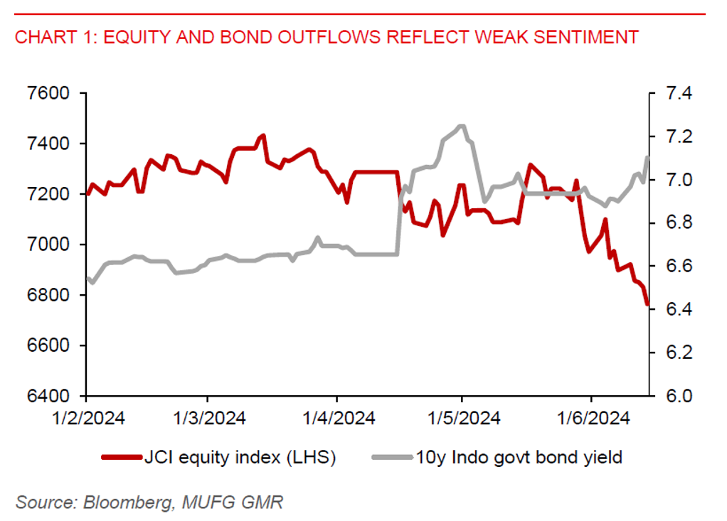 - The USD/IDR has broken the 16,300 level convincingly on the back of large domestic non-deliverable forward (DNDF) maturity and perhaps partly on concerns about the fiscal plans proposed by incoming President Prabowo to raise the government debt level to 50% of GDP from 39% in 2023. Equity and bond outflows have persisted, with the Jakarta composite index falling nearly 10% since its mid-March peak, while 10y yield has risen by 10bps to 7.09% at the time of writing, which is the highest since early May (Chart 1).