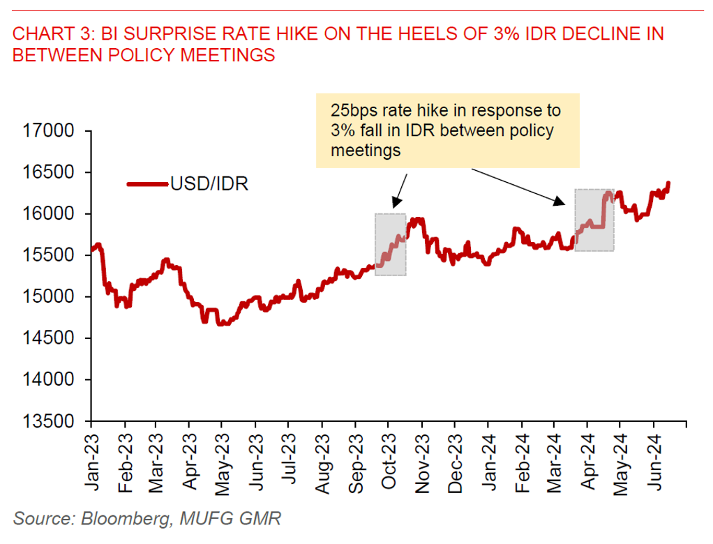 - The risk of a BI-rate hike in the upcoming policy meeting on 20 June has increased. We think the likelihood of another 25bps rate hike is high, especially if the rupiah falls to 16,450 per US dollar in the coming week, representing about a 2.9% drop since the last BI meeting. During the April hike, the rupiah fell by 2.9% following the March meeting (Chart 3). The surprise BI hike back in October 2023 also came on the heels of a 3% drop in the rupiah compared to the levels seen in the preceding meeting in September.
