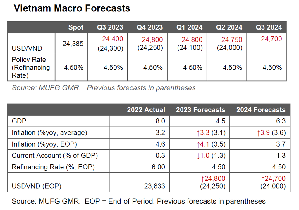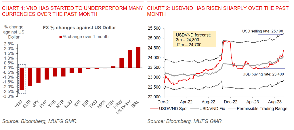 - We raise our USDVND forecasts further to 24,800 in 3 months, and 24,700 in 12 months, up from 24,300 and 24,000 previously. Our forecasts imply continued underperformance of VND against Asian currencies (see Chart 1).