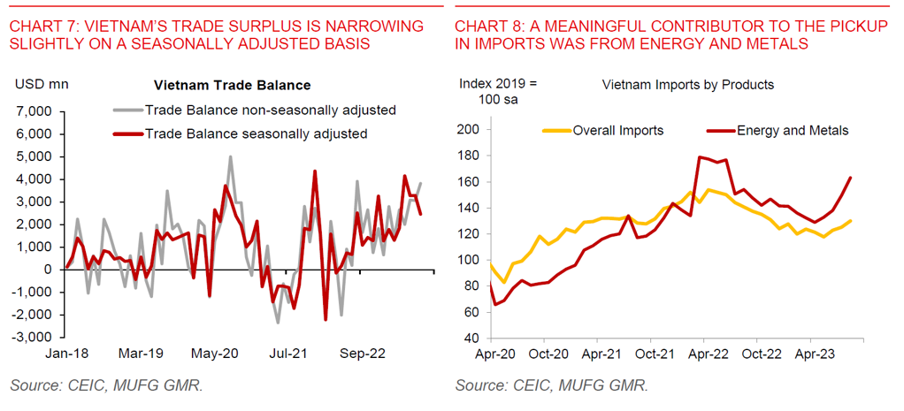 - Nonetheless, it’s important to stress that we still do not expect sustained sharp VND weakness akin to what we saw in 2022, and our forecasts for USDVND to stabilise in 2024 reflect that. We expect the Fed to pause and cut rates into 2024, commodity prices to eventually stabilise, and domestic demand recovery in Vietnam to be gradual, leading to a still decent trade surplus.