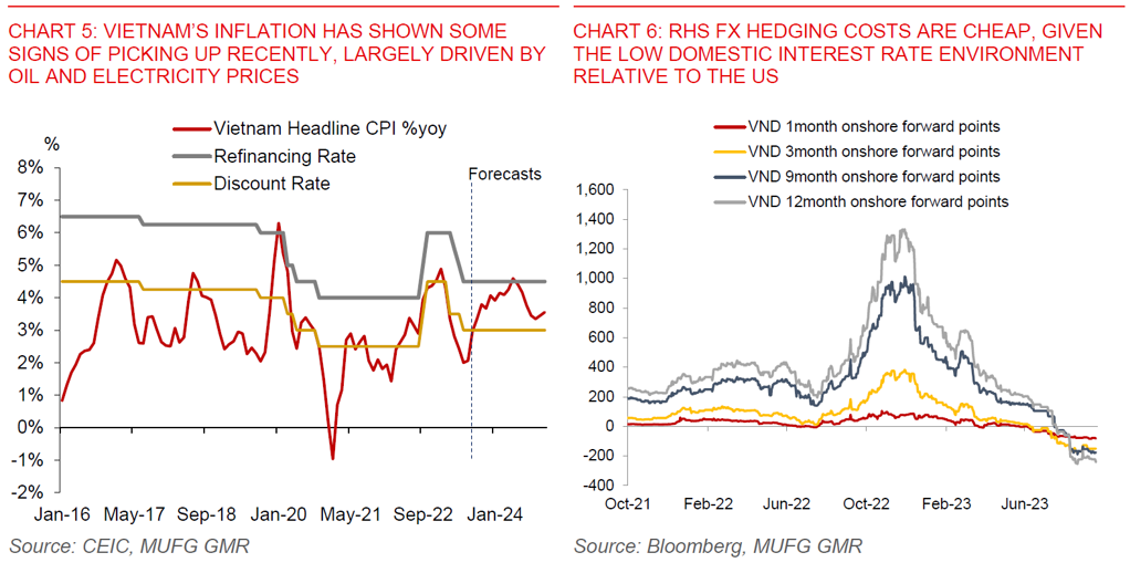 - In many ways, the three factors driving VND weaker which we highlighted in our previous report are still very relevant. First, low domestic interest rates, and with that depressed RHS FX hedging costs (Chart 3). Second, a pickup in imports leading to smaller trade surplus, driven in part by a rise in oil prices. Third, an acceleration in inflation, which has driven down domestic real interest rates.