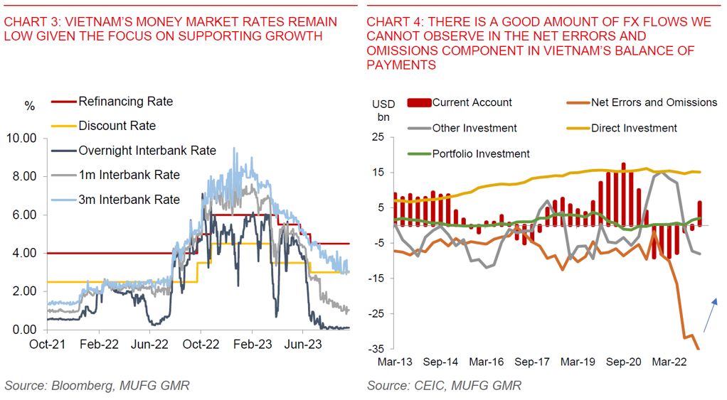 - Domestically, we also highlighted that there is a good chunk of FX flows we cannot measure in Vietnam. There is certainly a possibility that capital outflows and USD hoarding have picked up again, especially with US rates still high and US Dollar deposits not paid interest rates in Vietnam.