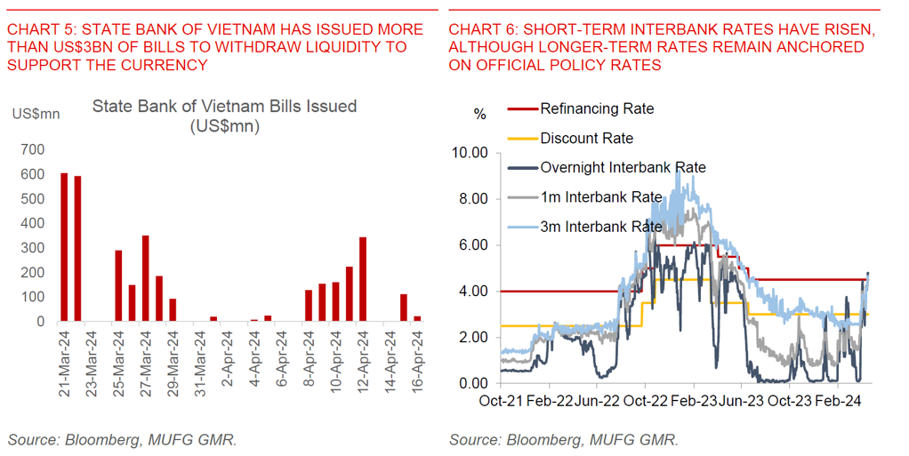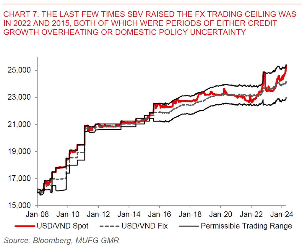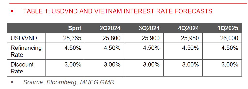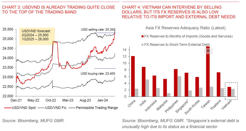 - Summary: We revise up our USDVND forecasts to 25,800 for 2Q2024, and 26,000 for 1Q2025 (up from 24,800 previously) given our expectation for a stronger Dollar near-term, coupled with more persistent than expected domestic capital outflows. Our forecasts imply front-loaded VND weakness and underperformance against other Asian currencies. The bias of risk is tilted towards VND weakness, especially if the State Bank of Vietnam chooses to adjust the ceiling of the trading band upwards, which we stress is not our base case right now.