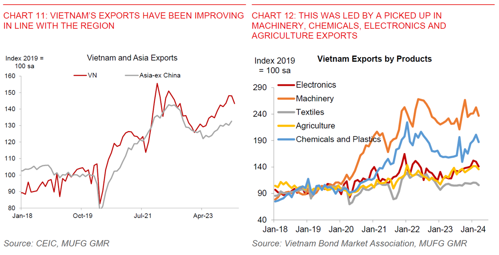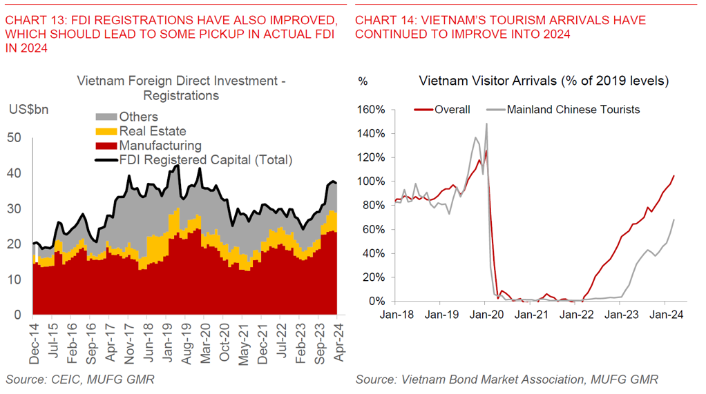 - We entered into this year thinking that there are some emerging green shoots in Vietnam’s economy, which could also support the currency (see Asia FX Outlook 2Q2024 – Light at the end of the tunnel). On the external front, these positives include an improvement in exports led by a turn in the global manufacturing and tech cycle. Tourism also continues to improve, helped by e-visa relaxation policies implemented last year. Exports and tourism should also have some gradual indirect positive spillovers into employment and ultimately consumption spending. FDI registrations have also picked up, which will likely lead to a rise in actual FDI moving forward in 2024.