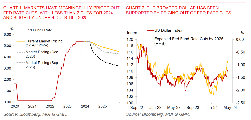 - Our global team thinks that the Dollar has scope to rise further over the next one to two months with EURUSD possibly trading towards 1.050, although they stress this window for Dollar strength will likely close in 2H2024 especially given that markets have already meaningfully priced out Fed rate cuts into 2025 (see FX Weekly – USD has scope for further gains , FX Daily, and Chart 1 below).