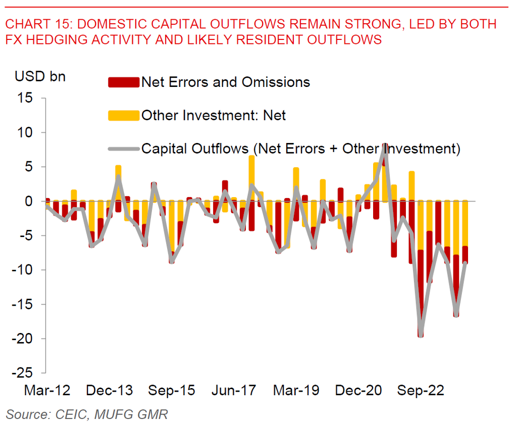 - Nonetheless, domestic capital outflows have been much more persistent than what we had initially assumed. We think the fundamental factors driving these outflows is a wide gap between US rates and domestic rates, coupled with high domestic policy uncertainty. These factors driving outflows are unlikely to turn for the better unless we see a meaningfully lower level of US rates and/or a sharp rise in domestic rates for instance.