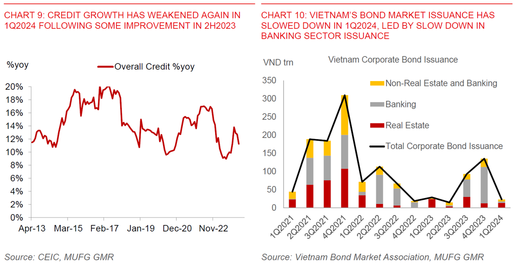 - Meanwhile, credit growth and bond market issuance have also taken a leg down in 1Q2024 following some thawing in sentiment in 4Q2023. This has led to renewed concerns about the health and sustainability of rebound in the domestic economy.