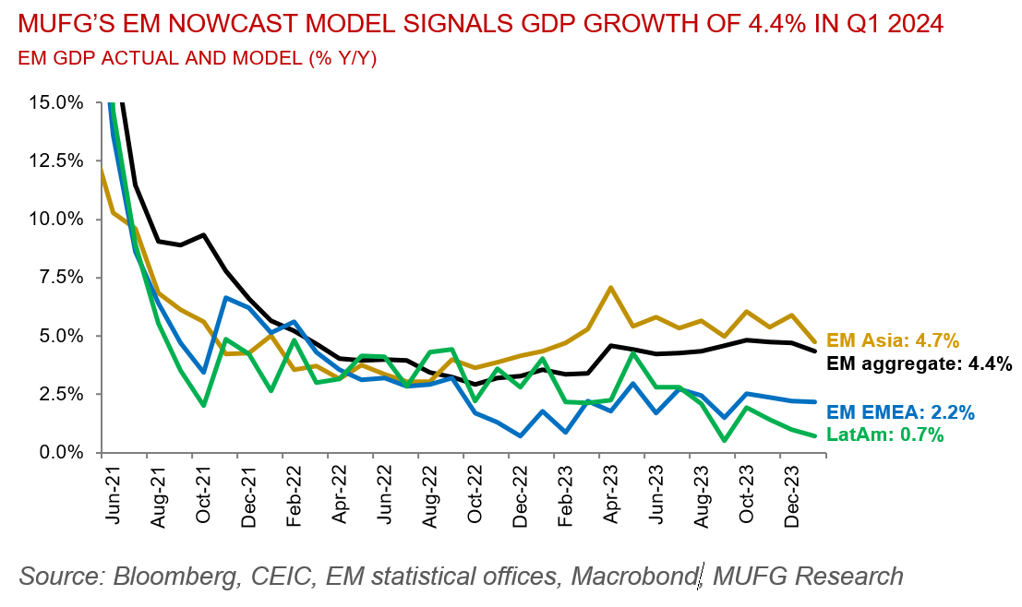 - Emerging markets (EM) nowcast modelling framework that we launched last year (see here) estimates EM real GDP growth (seasonally adjusted annual rate) in Q1 2024 at 4.4% y/y (consensus 3.8%).