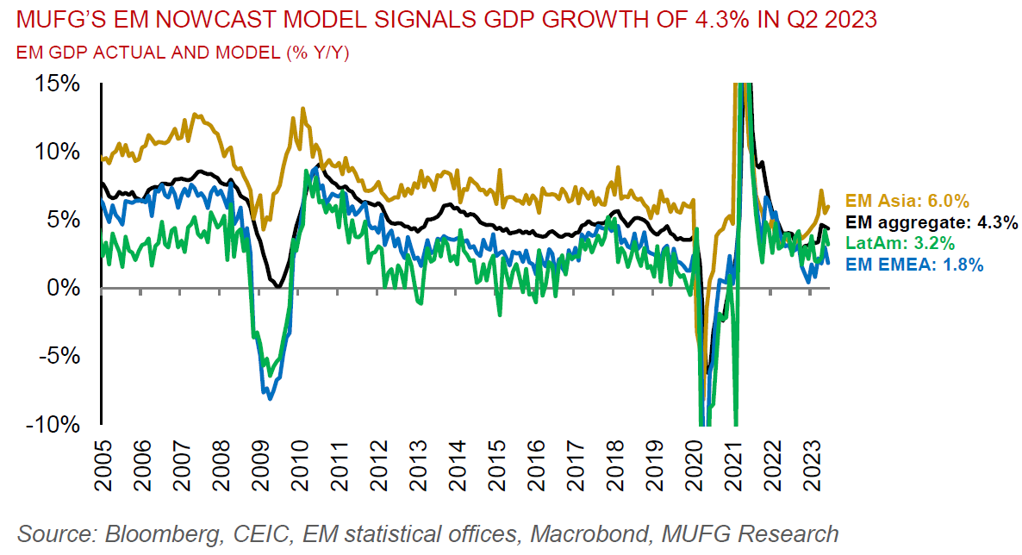 - Our EM nowcast modelling framework that we launched earlier this year (see here) continues to estimate EM real GDP growth (seasonally adjusted annual rate) in Q2 2023 at 4.3% as of June 2023 (consensus 5.6%).