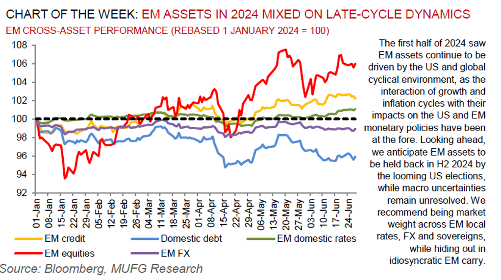 At the start of this year, we had expected building drags from a slowing China and the 2021-23 global hiking cycle to pull down the EM complex. Yet, EMs defied expectations in H1 2024, buoyed by the resiliency in the consumer. Disinflation has come a long way but progress is now slowing and becoming more heterogeneous across countries. Cautious EM rate cuts looks set to continue in parts of EM EMEA (notably the CEE region) and LatAm, broadening to EM Asia by Q4 2024 – though remains conditional on the Fed and the US dollar. We anticipate EM assets to be held back in H2 2024 by the looming US elections, while macro uncertainties remain unresolved. From a positioning lens, trading a strong global macro trend for EMs does not look like a great risk/reward strategy in H2 2024. On the one hand, there is still a tight US labour market which can generate sticky inflation, with few signs of corporate/household imbalances, so rates may remain higher-for-longer. On the other hand, growth looks to be slowing with the cumulative impact of rate hikes may still be lagging through the economy. Thus, we recommend being market weight across EM local rates, FX and sovereigns, while hiding out in idiosyncratic EM carry.