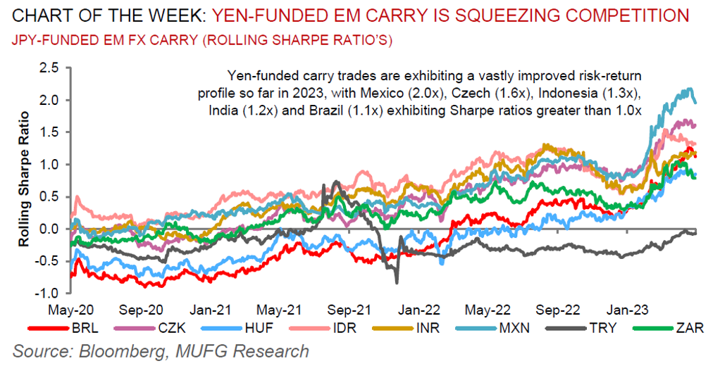RUB weakness stands out amidst more mixed EM FX performance. Risks remain titled to downside as RUB falls back towards last year’s lows from March. Meanwhile, the best performing EM currency over the past week has been the THB (+1.1% vs. USD).