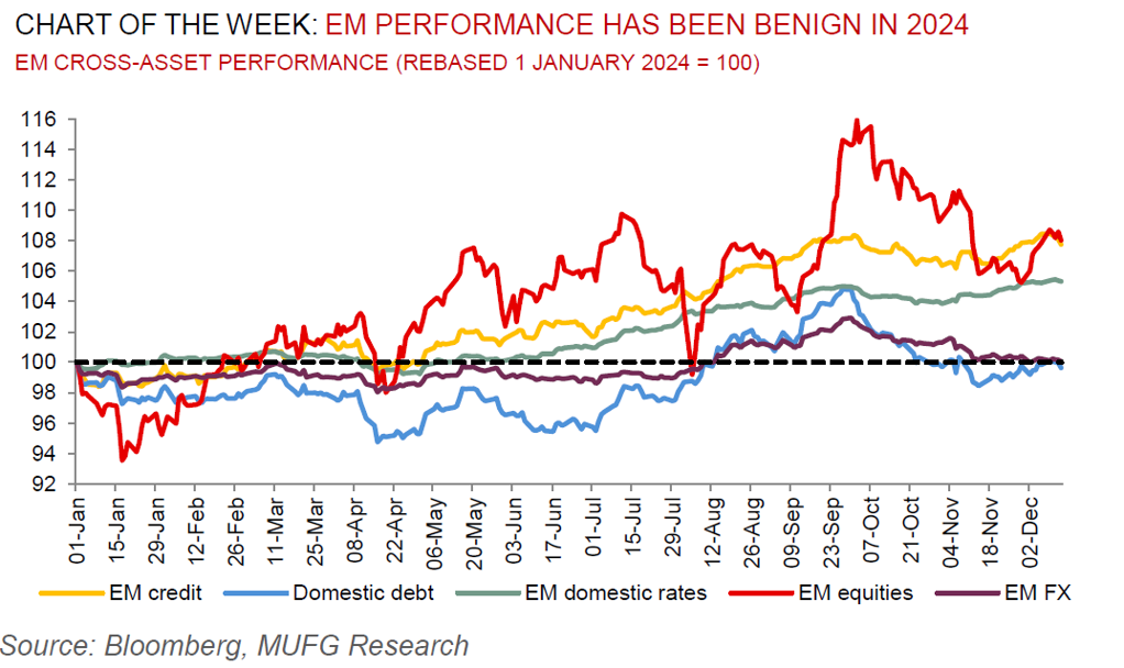 2024 has been a year dominated by a range of themes, with global and local factors capturing the markets’ attention along the way, including elections, the beginning of policy rate cuts in developed markets (DM), China stimulus, the carry trade unwind, recession concerns and geopolitics. Amidst this confluence of drivers, emerging markets (EM) have generally held up quite well, but with divergences across both asset classes and EM regions. Looking into 2025, we expect many of the largest EMs to slow, including all of the BRIC (Brazil, Russia, India and China) economies. However, we expect rebounds in a number of EMs that have undergone sharp macroeconomic adjustments and/or military conflict including Argentina, Egypt, Israel, Saudi Arabia and to a lesser extent the Central East European (CEE) economies. From a cross-asset perspective, we envisage equities – especially in more shielded from volatility economies – as best placed for 2025’s plethora of challenges, with EM FX to be pressured by tariffs and a strong US dollar.