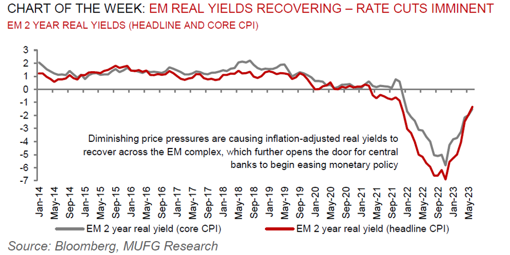 Last week, EM currencies staged a strong rally over the past week driven by the broad-based USD sell-off. The main trigger for the USD sell-off has been the release of more evidence (US CPI & PPI reports for June) revealing that inflation in the US continues to slow. It has given market participants more confidence that the Fed will soon bring an end to their rate hike cycle, and then begin to consider rate cuts next year if inflation continues to fall closer to their inflation target.