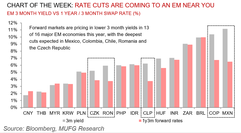 EM FX falls back to last year’s autumn lows vs. USD - US economic resilience and firmer inflation at start of this year creating more challenging external backdrop. Meanwhile, CZK weakens on back of CNB rate cut speculation although currency weakness may slow further easing.