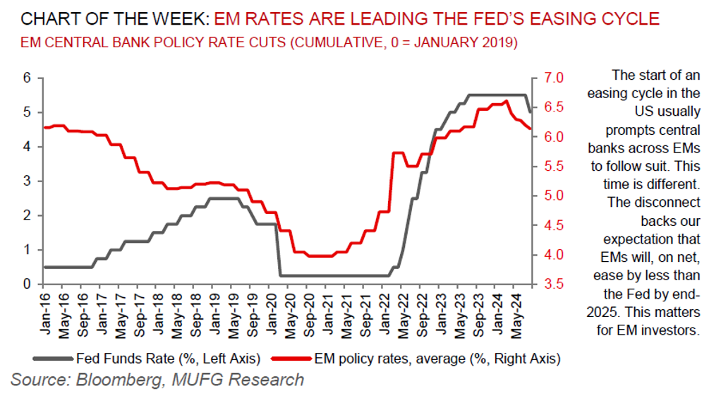 The US Federal Reserve’s (Fed) definitive shift away from focusing solely on inflation risks and towards labour market considerations with an above-consensus 50bp rate cut last week provided a clear signal about the intent to remain ahead of the curve. While that motivation keeps the risk of further large adjustments alive in the near term, it also trims the risk that gradualism today could result in deeper cuts down the road. From here the responsibility sits with the data to further diminish downside risks. As we have catalogued over recent weeks, Fed easing should relax the constraints on EM policymakers and support a widening out of the EM rate easing cycle – with our eyes on India, South Korea, Taiwan and Turkey to join their early-cutting EM peers. We would however caution that whilst the Fed is a supportive outcome for the EM complex, the investment horizon still remains capped by the upcoming US election. The policy proposals of former President Trump – including a 10pp increase in the effective US tariff rate – would prompt retaliatory measures from US trading partners and a potential strengthening of the US dollar. In a global “trade war” environment, EMs have more to lose than most.