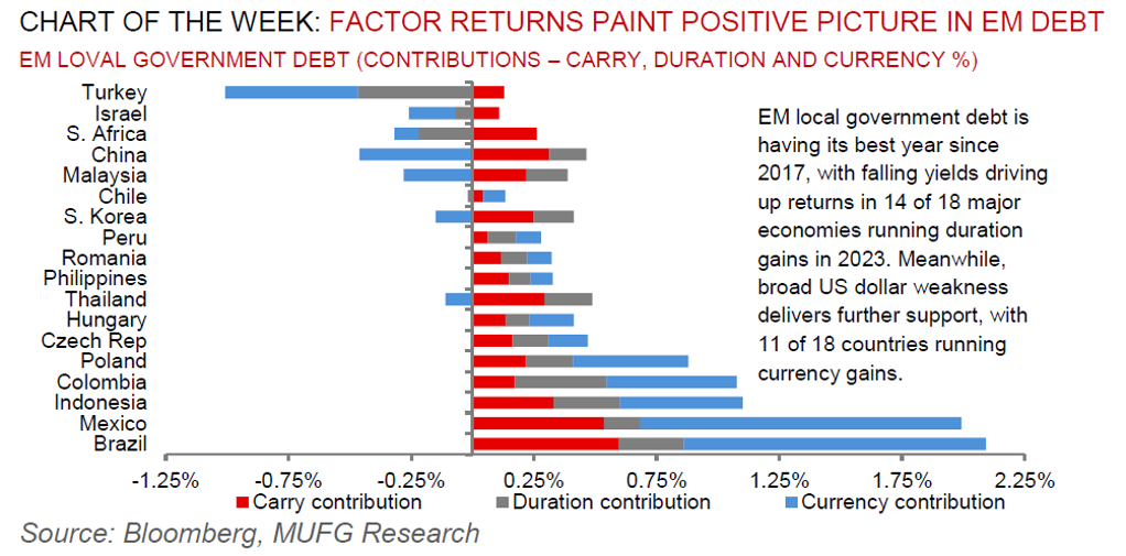 This week, we will have rates meetings in Hungary (MUFG and consensus on hold at 13.00%) and Ukraine (MUFG: -200bp to 23.00%; consensus: 22.50%). Additionally, the Central Bank of Turkey (CBRT) is set to release its latest quarterly inflation report. Beyond EMs, it’s a busy week on the rates calendar with the Federal Reserve, ECB and Bank of Japan (BoJ) all set to decide their next move monetary policy.