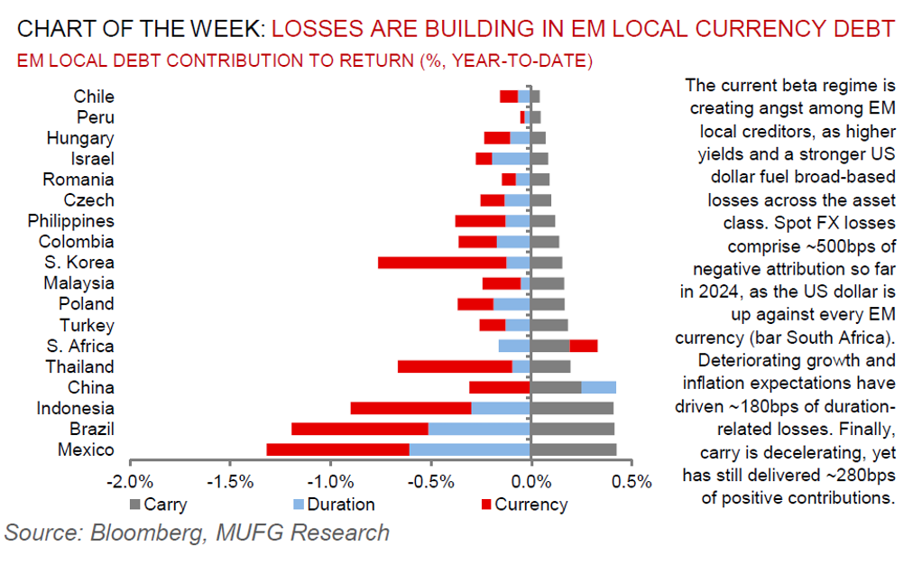 Over the past week EM currency performance has been more mixed, the RUB (+1.4% vs. USD) and ZAR (+1.2%) have continued to strengthen behind the best performing currency of the MXN (+2.4%) that has started to rebound following the sharp post-Mexican election sell-off. The USD has strengthened for three consecutive weeks even as US yields have been correcting lower. The 10-year US Treasury yield has been consolidating at just above the 4.20% over the past week after hitting a high of 4.74% in late April. The release in the week ahead of the latest US PCE deflator report for May is expected to provide further confirmation that core inflation has slowed in recent months.