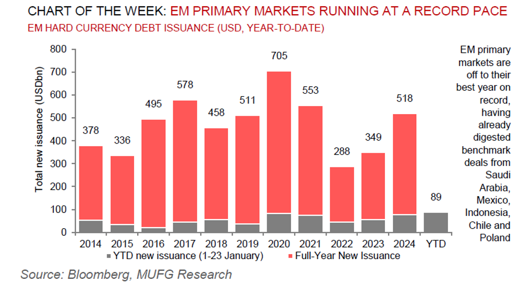 The latest weekly IIF flow data signalled that EM securities attracted USD14.4bn in December 2024 driven by USD17.6bn into debt markets, while equities faced USD3.1bn in outflows.