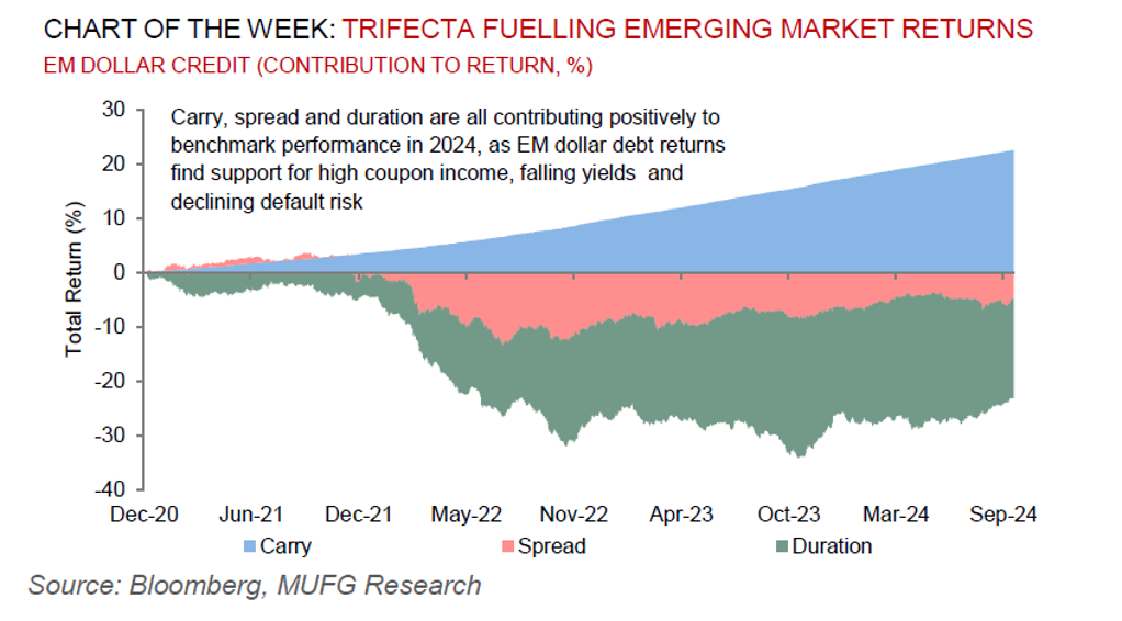 Against the backdrop of Fed easing and lower oil prices, unexpected China stimulus became the cherry on top. Have we finally arrived in the valley of the USD smile? While the broad narrative is that a global soft landing combined with Fed easing (if realised) would eventually result in broad USD weakness, the path to get to that destination at least on this side of the US elections could be shaky. From an EM perspective, Golden Week came early in Chinese markets as Chinese authorities showed some urgency in responding to weak domestic demand and depressed local asset markets with a slew of policy initiatives. Ultimately, we do not view that the CNY is likely to be the best expression of renewed China optimism–Chinese stocks, and to a lesser extent, other China related-currencies in EM (such as KRW) may be more responsive.