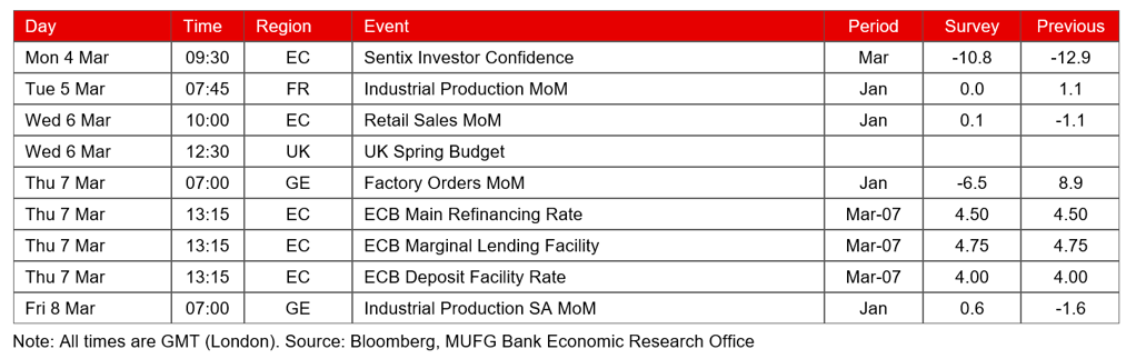 As well as the ECB meeting next week’s focus will be on the UK Spring Budget event. The governing Conservative party is trailing in the polls and the next election must be held by January 2025 (but autumn this year remains the most likely timing to our minds). Against that background, some personal income tax cuts were announced in November last year, and the indications are that there’s more to come next week. The government has limited fiscal leeway but there is still scope for another decrease, probably via the national insurance rate.