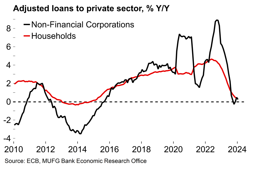 So it seems that the euro area recovery could be more muted and slower to materialise than previously thought. We are tracking GDP growth at 0.0% Q/Q again in Q1 this year before activity picks up more meaningfully in H2. Our current forecast for annual average growth in 2024 is 0.4%, which we have revised down from the 0.7% we had in our previous quarterly update in December.