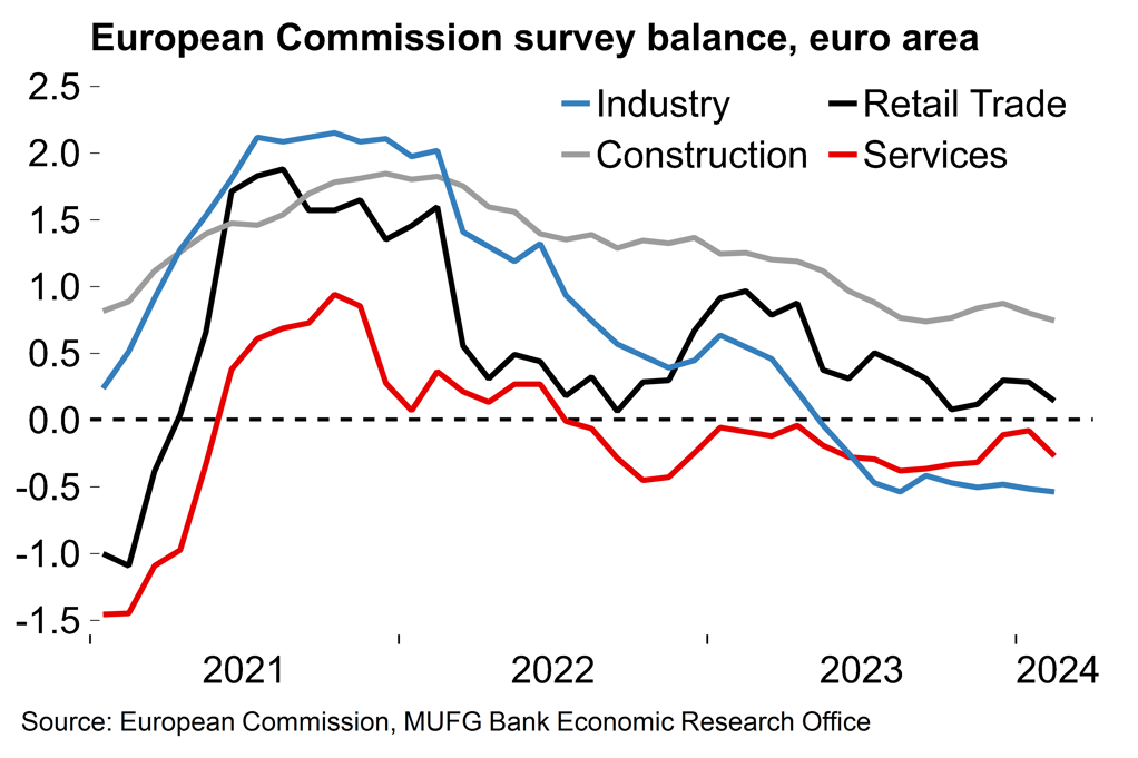 Despite these latest figures, we remain of the view that consumer spending will drive better quarterly growth figures later in the year as real household disposable incomes recover. There may be better news for the beleaguered manufacturing sector as the inventory cycle turns. But evidence for any immediate recovery remains limited as it stands. The euro area economy may have dodged technical recession in Q4, but the overall picture remains one of stagnation – and that seems likely to have remained the case at the start of 2024.