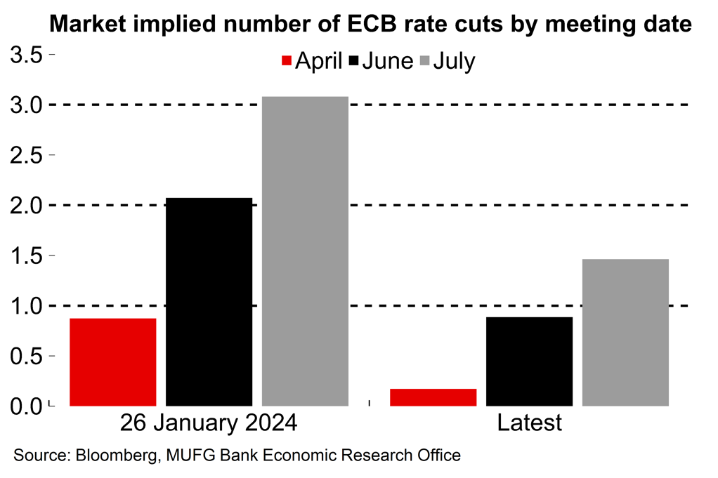 - The ECB will look to retain the current flexible, data-dependent setting at next week’s policy meeting. While there hasn’t been much in the data in recent weeks to support the case for earlier easing we are still confident that the path to rate cuts should clear by mid-year as evidence of easing wage growth is set to build.