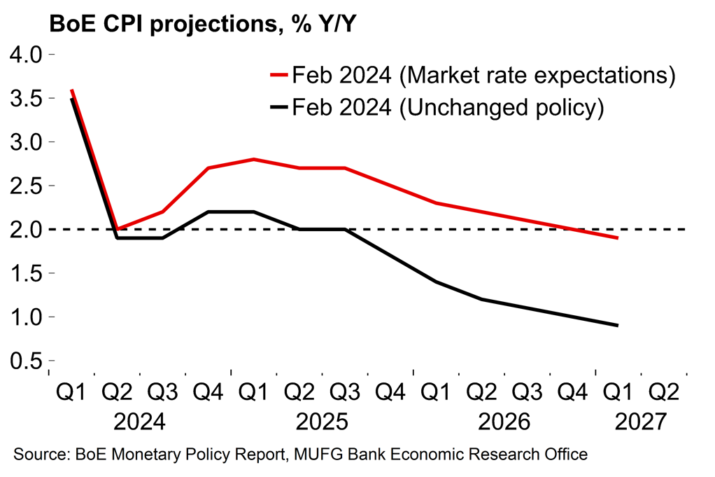 Chart 6: The BoE’s latest projections suggest cuts are needed to prevent inflation undershooting the target