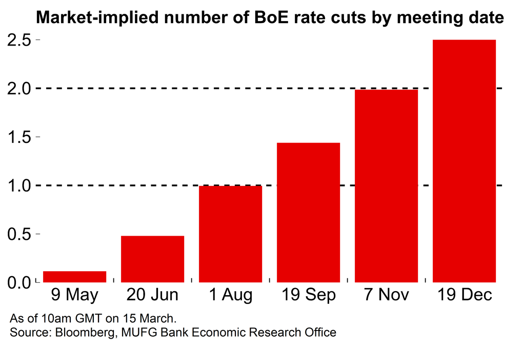 There’s also a window before conditions might make it tougher to embark on an easing cycle. The BoE’s latest projections suggest that inflation will fall sharply to below target in Q2 (following the fall in household energy prices from April) before edging up again later in the year due to the persistence of some underlying price pressures. Our view is that inflation will prove to be a little less sticky than the BoE set out in the last batch of projections. Nonetheless, policymakers will be mindful of the numbers as they stand and that it would be a communication challenge to start the ball rolling on rate cuts when headline inflation is moving higher.