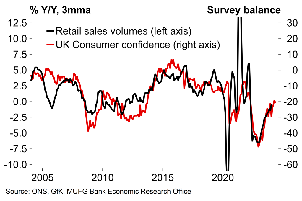 That said, our view remains that the H2 2023 UK technical recession will be mild and short-lived. Across Q1 as a whole we are currently tracking GDP growth at 0.2% Q/Q. After a strong start to the year, there has been some signs of moderation in a few key surveys recently – both consumer confidence and the UK services PMI edged a little lower in February. But the overall picture from the soft data remains markedly stronger than it did in Q4 last year and is consistent with a return to growth this quarter.