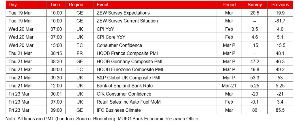 As well as the BoE meeting and UK CPI data mentioned above, there will be a range of key European survey data for March released next week. The focus will be on the flash PMIs for March.