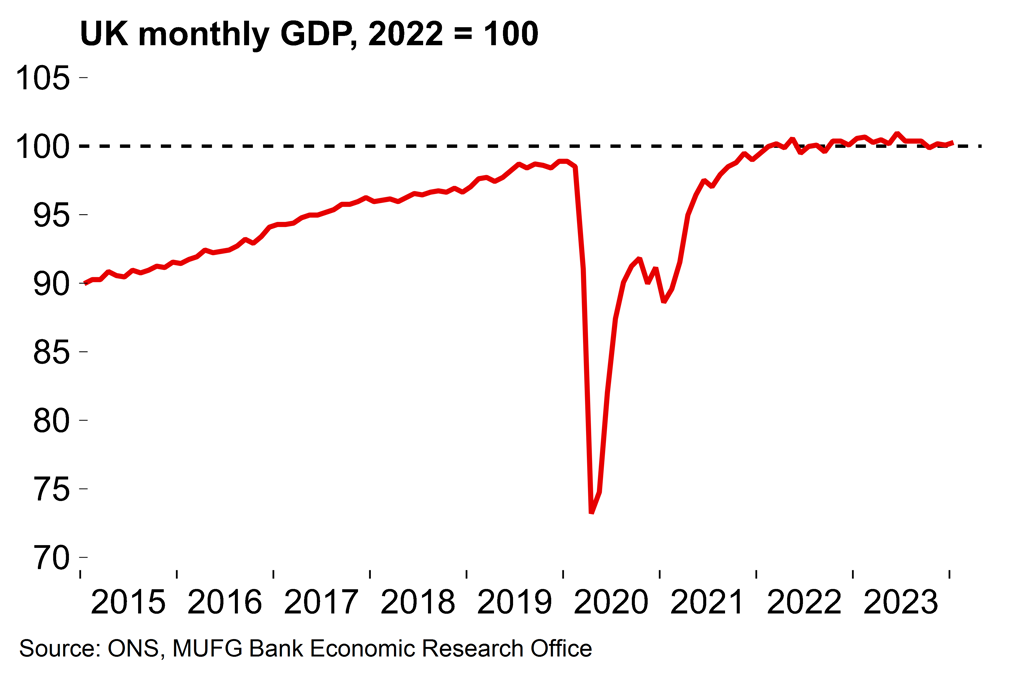 The monthly UK GDP estimate showed 0.2% M/M growth in January. While this represents a good start to the year after the deeper-than-expected 0.3% Q/Q contraction in Q4 2023, it’s still too early to definitively declare that the economy has turned a corner. The monthly growth numbers are both volatile – fluctuating around an essentially flat trend since 2022 – and prone to significant revision. The broader picture remains one of a stagnant UK economy: GDP was slightly down on a rolling three-month basis (-0.1% 3m/3m) and annually (-0.3% Y/Y).